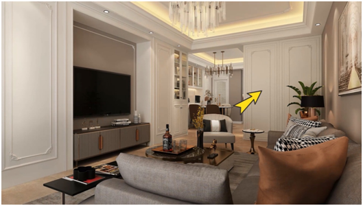 改造前的客厅拐角形成空间暗区,深色家具降低房间整体明度;展示柜和冰箱打破背景墙整体感,空间杂乱。