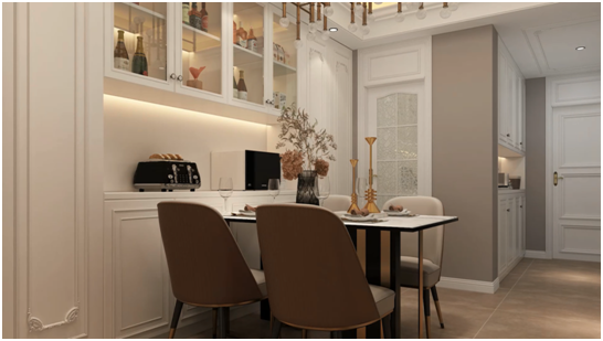设计师利用定制柜隐藏储物间的门,视觉上拉平空间,与玄关处延长90cm的收纳展示区呼应,创造出完整的就餐区域;改变厨房门方向后,厨餐厅的距离缩短,餐厨动线得到优化;同时在收纳墙上预留电视空间,满足业主就餐时也能看电视的需求。