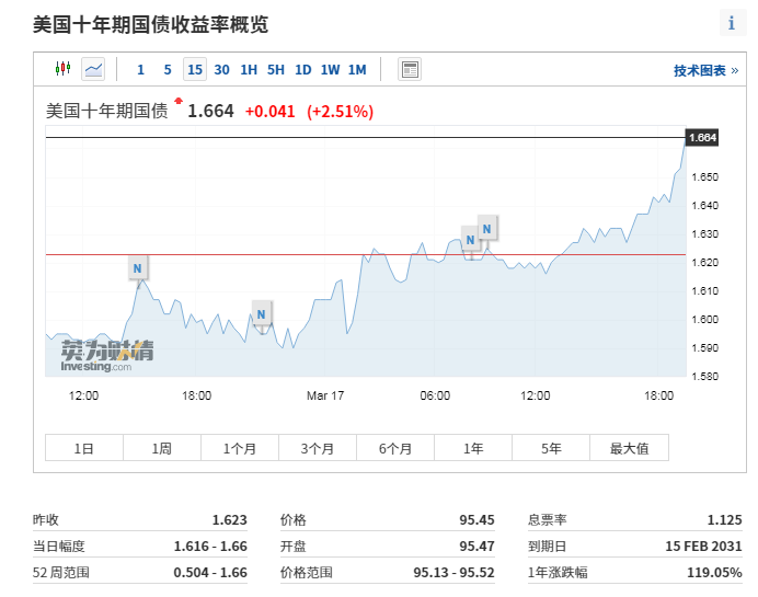 北京时间3月17日晚间,美国10年期国债收益率持续走高并站上1.65%,逼近2020年1月份时高点。截至发稿,报1.664%,日内上涨2.51%;美国30年期国债收益率升至2.419%,为2019年11月以来最高水平。