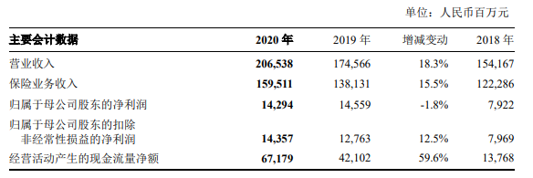 2020年,公司实现总保费收入1595.11亿元,同比增长15.5%,其中,长期险首年保费390.22亿元,同比增长53.7%;续期业务实现保费1129.64亿元,同比增长6.8%。