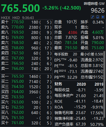 3月29日,哔哩哔哩港股上市首日开盘破发,截至发稿,该股跌幅扩大至5.26%,报765.5港元。