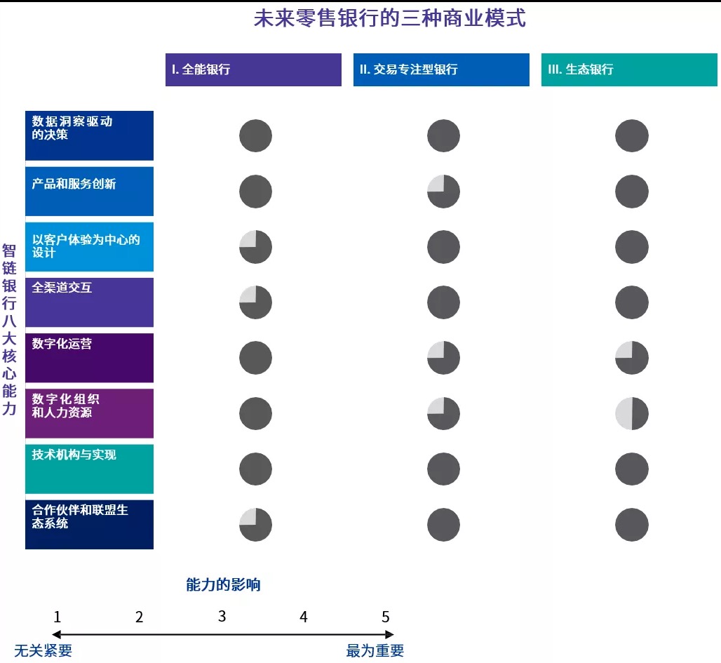 不同核心能力对于不同零售银行商业模式的相对价值和重要性不同,相应银行在选择能力构建的优先级也会不同。但是需要注意的是,八大能力贯穿整个组织,必须统筹部署,进而重塑运营模式,为客户和银行创造价值。