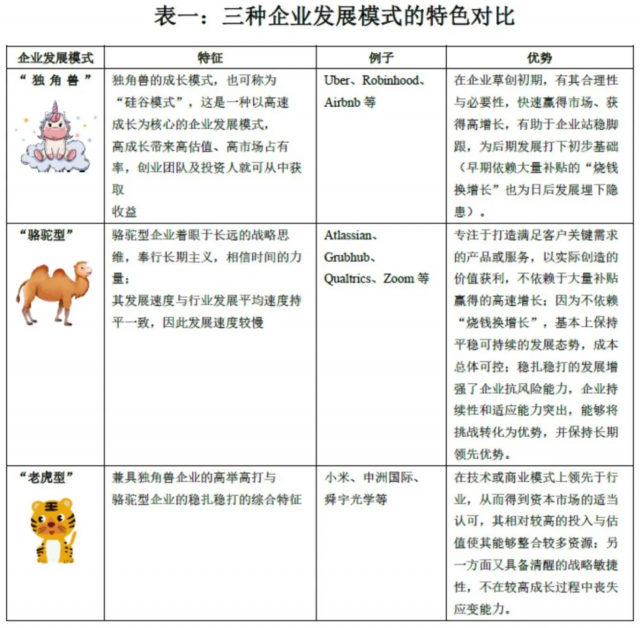 可见独角兽企业发展模式不是唯一的发展模式,我们需要考虑其他不同的模式,至少包括“骆驼型”与“老虎型”。