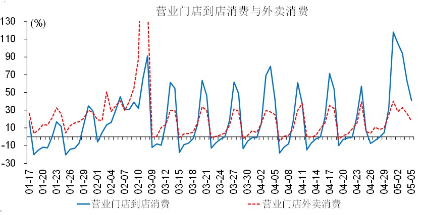 接待游客人数与旅游收入持续改善,五一游客接待人数已完全恢复至2019年同期水平;五一期间餐饮营业到店消费量日均84.33%、高于清明假期间的63.5%。