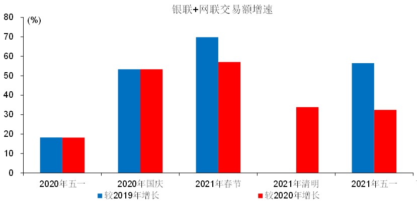 五一旅游收入1132亿元,可比口径较2019年下降23%;银联网联日均成交规模较2019年同期增长56.5%,与去年国庆大体相当、明显低于今年春节的 69.8%。