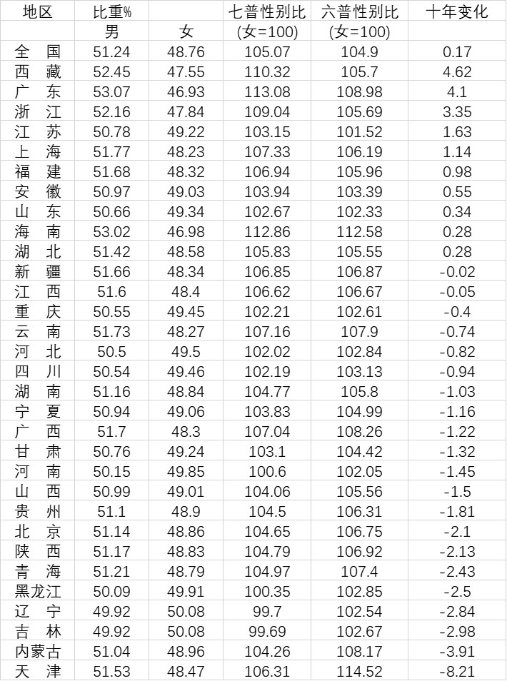 从十年来31个省份的性别比变化看,2010年,性别比最高的5个省份分别是天津(114.52)、海南(112.58)、广东(108.98),广西(108.26)、内蒙古(108.17)。而到2020年,性别比位居前五的省份,分别是广东、海南、西藏、浙江和上海。