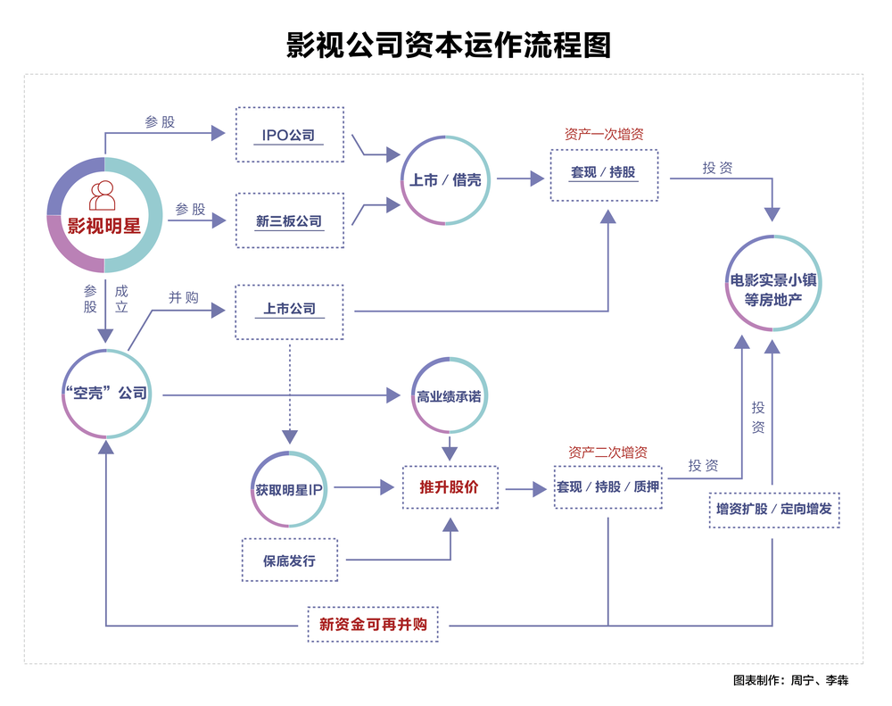 “天价片酬”背后隐匿的深层资本运作内幕值得高度警惕:与金融业和资本市场“去杠杆”大方向不同,部分知名影视上市公司近十年来纷纷放大杠杆、以小博大,通过“明星证券化→标的公司‘空壳’化→保底发行、票房造假哄抬股价→自买自卖、减持质押疯狂套现”的资本运作潜规则套路,掏空中小投资者,使遏制“天价片酬”举措大打折扣,引发资本市场巨大争议,甚至涉嫌操纵股价、扰乱金融秩序。通过资本运作实现“天价片酬”的具体步骤详解如下: