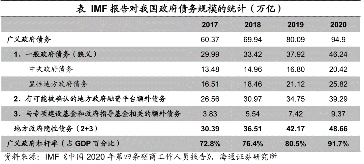 根据IMF估算,2020年地方政府融资平台的预算外债务、与专项建设基金和政府指导基金相关的债务大约分别有39.3万亿和9.4万亿元,合起来可看作为我国的地方政府隐性债务,共48.7万亿元,较2019年扩大了近6万亿。