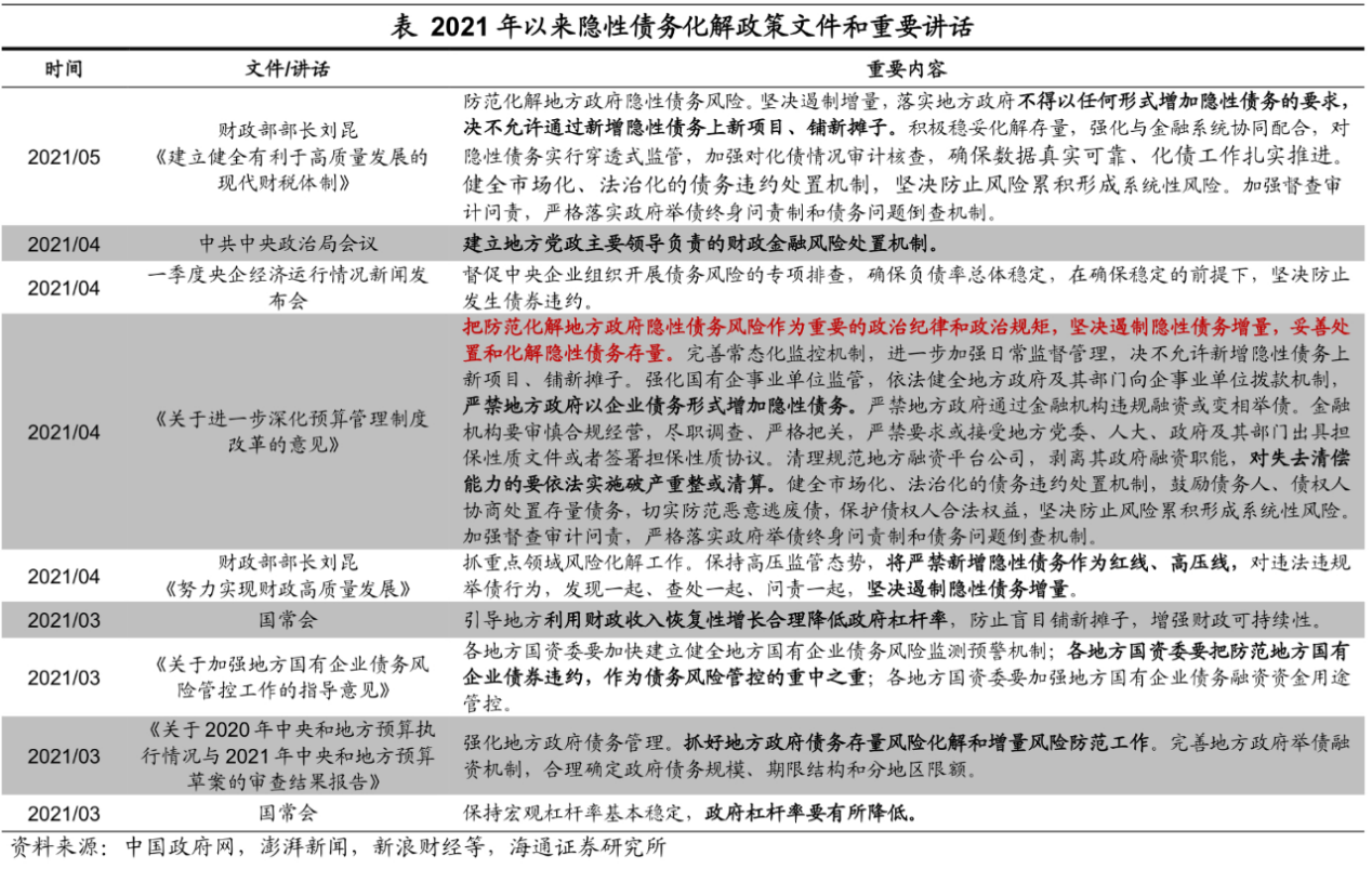 面对不断攀升的债务压力,在今年“稳增长压力较小的窗口期”,化解地方政府的债务风险,也会是宏观层面的一项重要工作。3月国常会提出“政府杠杆率要有所降低”,那么如何降低政府的杠杆率呢?我们在此前的报告《政府降杠杆:意味着什么?》中进行过测算:如果仅考虑政府显性负债,根据预算赤字和专项债规模计算,若全年名义GDP实现约9.8%的增长(根据预算赤字和赤字率倒推),到年底,今年的政府杠杆率不仅难以下降,反而还会上升约2.4个百分点。所以,今年政府降杠杆大概率不是降低包括一般债、专项债在内的狭义政府杠杆,而重点显然是在隐性负债上。包括此后连续推出的文件,其实都是在细化、落实地方隐性债务的控制、化解工作,《关于进一步深化预算管理制度改革的意见》中提出,防范化解地方隐性债务已经成为了重要的“政治纪律和政治规矩”。在目标的细化落实方面,政策强调要“坚决遏制隐性债务增量”、“妥善处置和化解隐性债务存量”。“坚决遏制隐性债务增量”的表述早在2017年中央政治局会议上已经提出,不过18年以来地方政府隐性债务规模仍在持续扩张。因而今年的政府隐性债务规模不一定严格压降,但在今年政策频率密集、力度升级的背景下,大概率隐性债务新增规模将较往年出现明显回落。