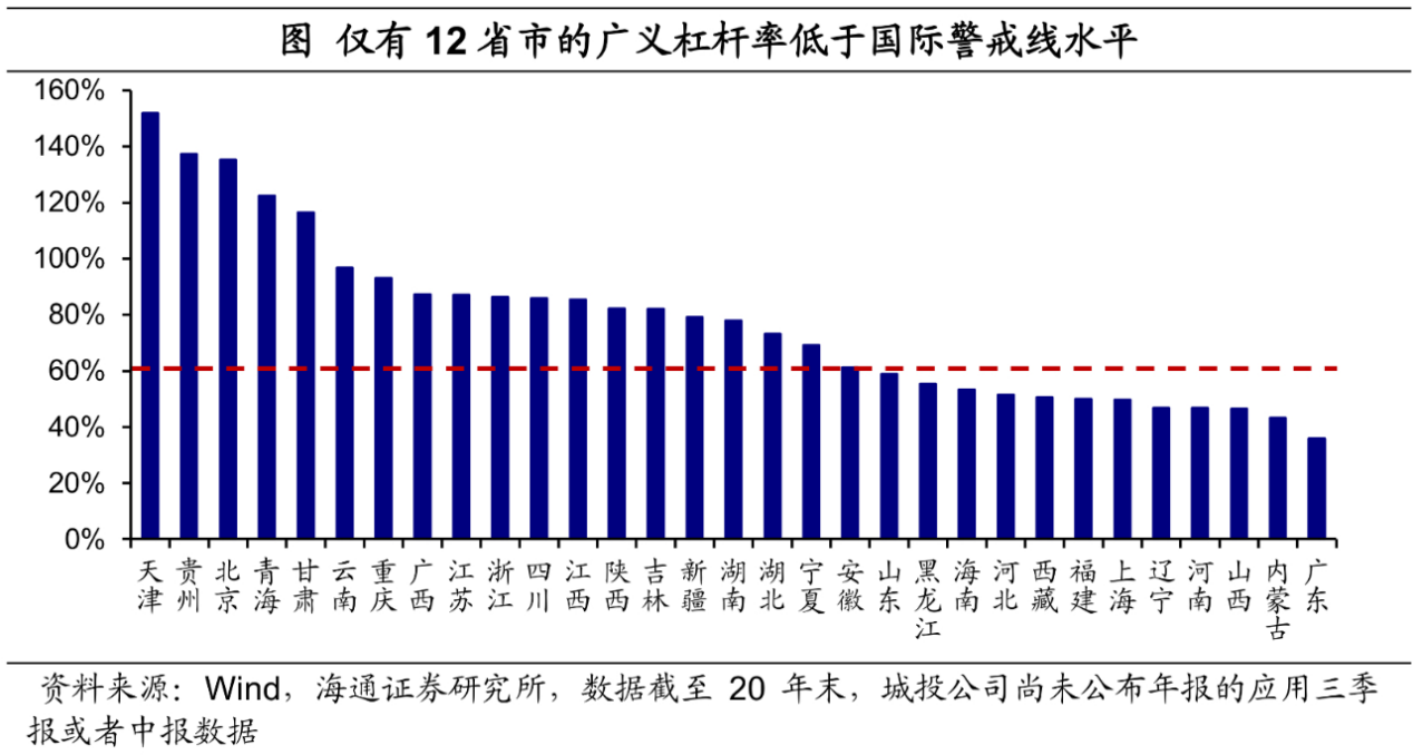 加上隐性债务后,我国整体政府杠杆率远超国际警戒线。将城投公司有息负债作为隐性负债计入广义政府债务[1],截至20年末,我国广义政府杠杆率达91.7%,相比2019年末增长了12.4个百分点,已经远超国际警戒线(60%)。政府部门可以说是去年加杠杆幅度最高的部门。国际对比来看,我国整体政府杠杆率也已不低。BIS对全球主要国家的政府杠杆率进行了统计,对比来看,若将隐性债务规模考虑在内,我国的政府杠杆率已明显高于新兴市场平均水平(高出32.4个百分点),不过相比发达经济体政府杠杆率(120%),我国财政仍留有一定空间。