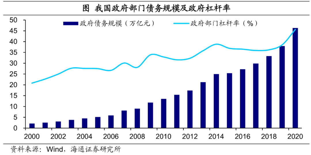 去年我国政府显性杠杆率抬升7.2个百分点。根据国家资产负债表研究中心的统计,截至20年末,我国政府部门债务共增加8.3万亿至46.3万亿元,相比2019年加杠杆(4.7万亿元)的速度明显提升;对应的杠杆率升至45.6%,较2019年末提升7.1个百分点。在7.1个百分点的抬升中,中央和地方政府的贡献分别达到43.7%和56.3%。
