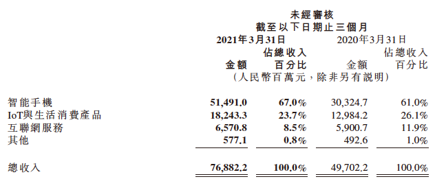 三大业务中,本季度小米全球智能手机出货量4940万台,同比增长69.1%;收入515亿元,同比增长69.8%;智能手机ASP为每部1042.1元,去年一季度为每部1038元。