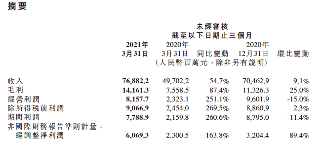 2021年5月26日,小米集团(1810.HK)公布2021年第一季度业绩。该季度公司总营收达人民币769亿元,同比增长54.7%;经调整净利润61亿元,同比增长163.8%;研发投入达30亿元,同比增长61.0%。