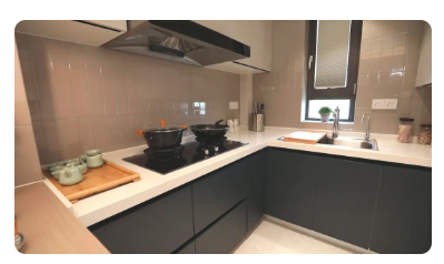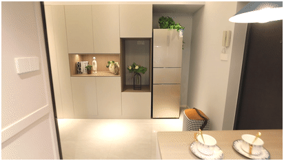 经过改造后将冰箱和多余的杂物全部收纳到玄关柜中,开放式厨房与玄关相连,扩大的空间远远不止一倍。台面长度增加,以后可以放很多小家电,柜体的设计也更加人性化,即使老人使用时也不用爬上爬下了,增加了安全性。