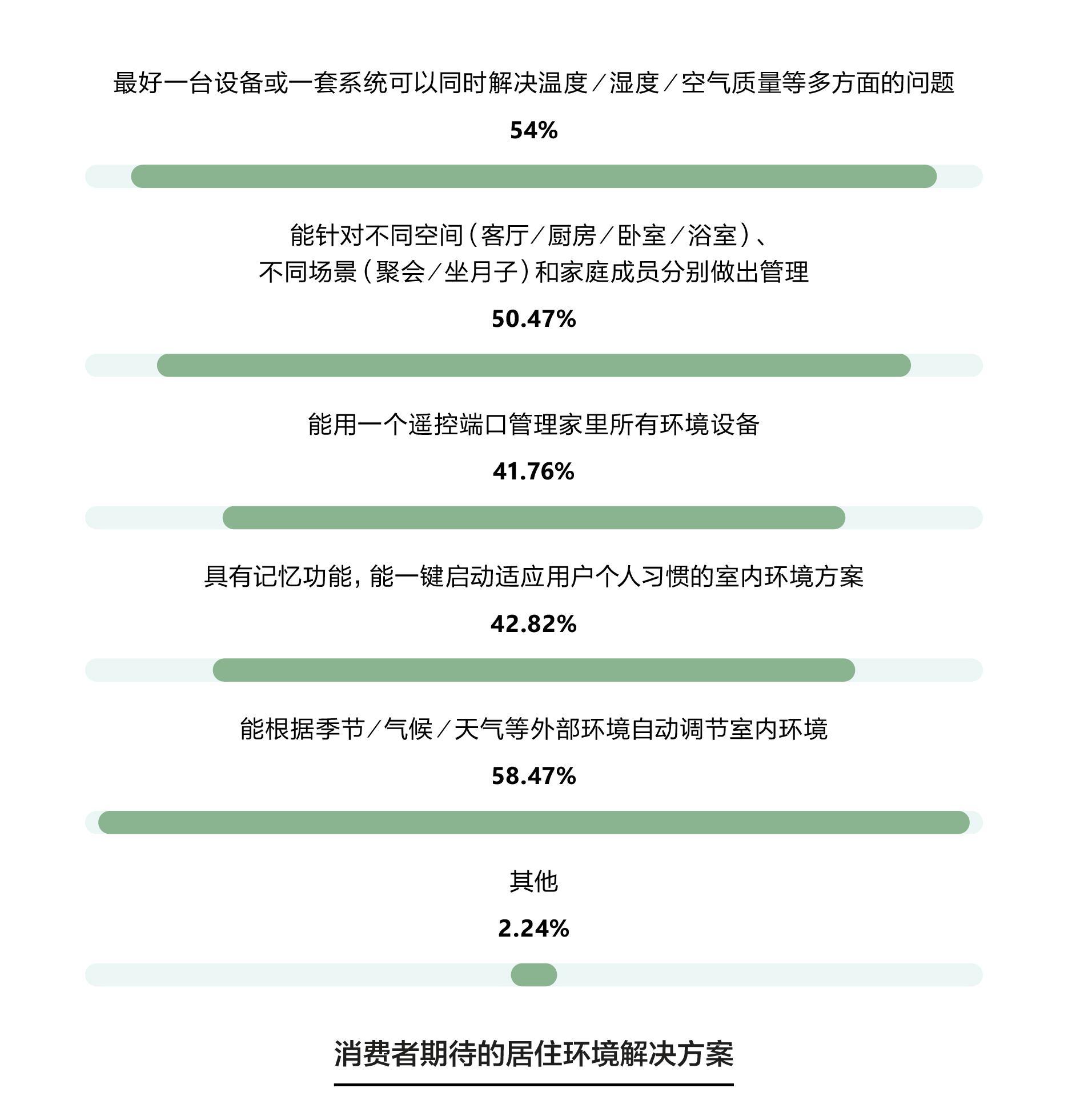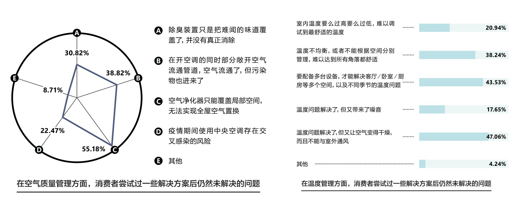 大众对室内健康的关注度正在消费端转化为不可忽视的购买欲——调查显示,空调、吸尘器、加湿器、空气净化器等多种健康单品渗透率已经过半,但健康类家电的消费升级仍在继续,消费者的关注点已不只是最基础的冷暖调节,而是进一步细分到了体感更丰富的湿度和空气质量管理,然而仅有1.76%的消费者表示他们尝试过的技术/方案效果完全解决了居住环境的问题。对于绝大多数消费者而言,常规的解决方案不仅效果有限,甚至带来了诸多“副作用”:比如空调在除湿的同时也拉低了温度,吹空调吹出“空调病”,房子越大要加载的设备数量越多难打理,诸多电器设备带来室内噪音等等。