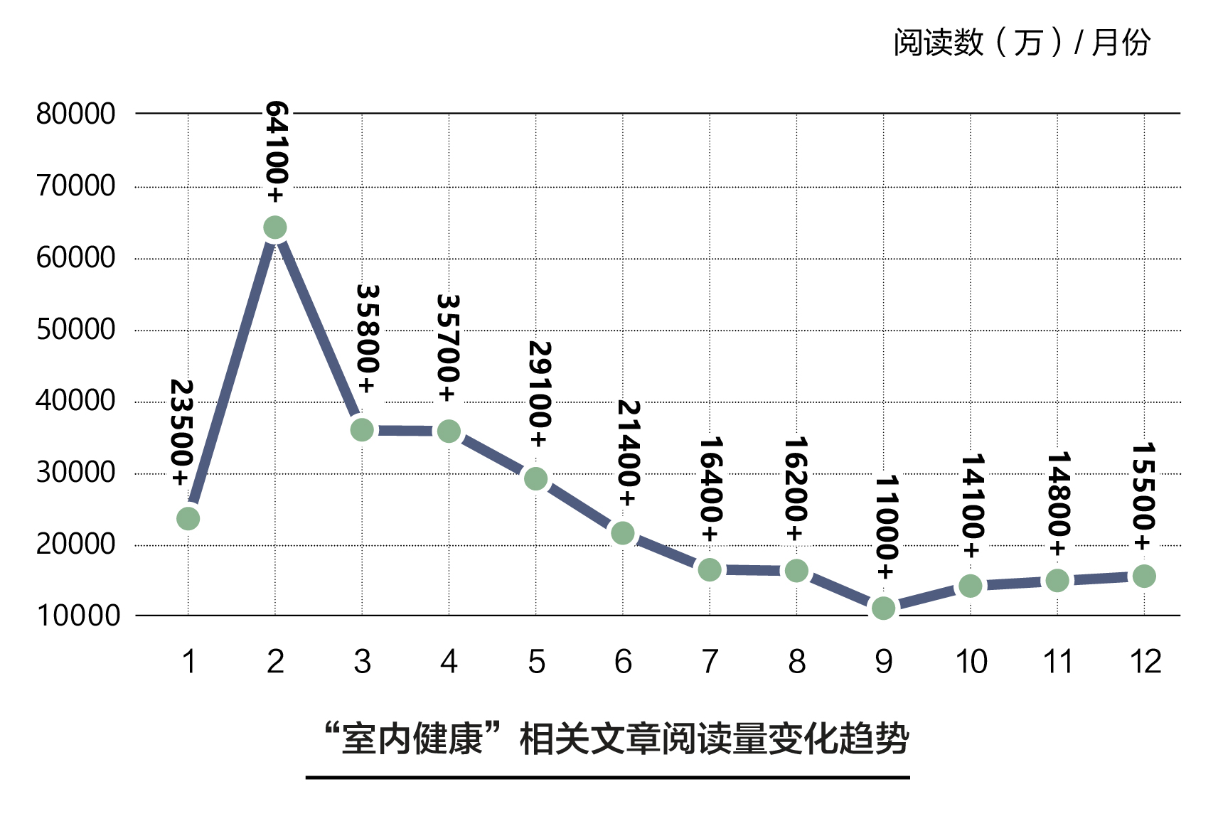 随着社会经济的快速发展,最近三四十年来,国人的生活发生了天翻地覆的变化,在家居消费领域,大众对居住环境的需求逐渐出现了从外在到内在、从显性到隐性的转变趋势——家不仅要大、有品位,更要实现健康、舒适的人居环境体验,健康成为美好生活新刚需。加之新冠疫情的刺激,去年互联网上对于“室内健康”相关话题的关注度猛增,全年阅读量近30亿,并在2月居家隔离期间达到峰值。