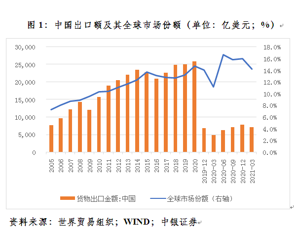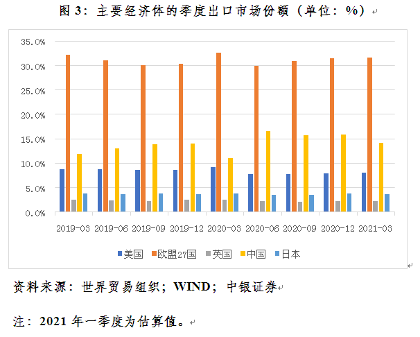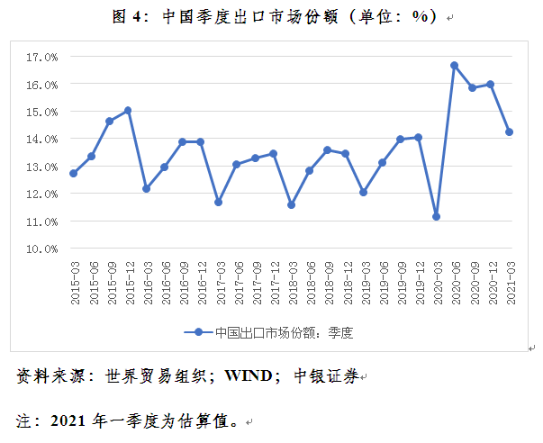 今年一季度,中国出口同比增长48.9%。这意味着,中国全球市场份额较去年同期有所上升。但鉴于去年初经济停摆造成的低基数效应,同比不能准确反映中国市场份额的变动,应该看季度环比才能更好把握变化的趋势。