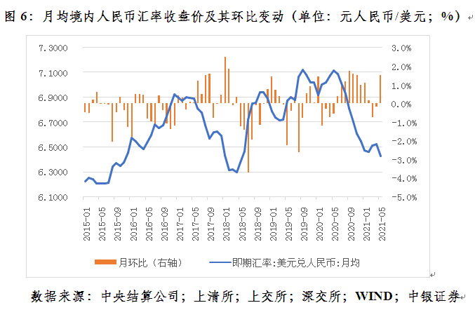 更重要的是,上次升值时间较为集中,2018年1月单月就涨了3%还多,该纪录迄今未破(见图5)。从月均收盘价看,月环比上涨1%以上的月份占了1/3,环比下跌的月份占了1/5。而这次升值时间分布比较均匀,月均收盘价月环比上涨1%以上的月份占了2/3,环比下跌的月份占了1/6(见图6)。
