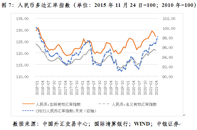 美元指数走弱是这波人民币升值的重要原因。由于很多非美元货币对美元汇率出现升值,所以,人民币对主要贸易伙伴货币的平均汇率(又称多边汇率)涨幅远小于对美元的双边汇率。过去一年来,中国外汇交易中心(CFETS)口径的人民币汇率指数累计上涨6%,远小于同期人民币汇率12%的涨幅。根据国际清算银行编制的人民币名义和实际有效汇率指数,去年6月份至今年5月份,分别仅上涨4%和3%(见图7)。可见,这波升值对中国出口竞争力的影响有限。