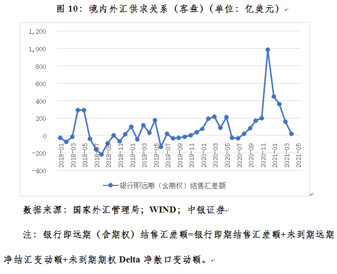 去年12月份,境内银行即远期(含期权)结售汇顺差合计984亿美元。除了年关效应外,还有就是去年11、12月份,每5个月的人民币环比涨幅分别高达7.3%和7.2%,进一步加大了企业财务风险。今年3、4月份,月均收盘价月环比连续下跌,其实给了出口企业喘息之机。故4月份,虽然人民币汇率随美指回落而反弹,但当月结售汇顺差仅有20亿美元,为去年9月份以来最低(见图9和图10)。
