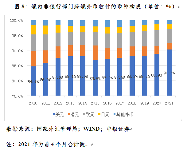 但是,升值对国内企业的财务冲击却不容低估。企业出口从接单到生产、发货再到收款,中间有一个时间差(又称为账期)。过去,通常是3到4个月。现在因疫情肆虐,国际物流受阻、供应链中断,账期可能延至4到5个月。目前,中国跨境贸易计价结算中,人民币占比约两成,剩下的都是外币计价结算。外币计价结算中,今年前4个月,美元占比高达90.3%,较2015年高出3.5个百分点(见图8)。如此,国内企业出口就容易暴露在人民币持续单边升值的风险之下。
