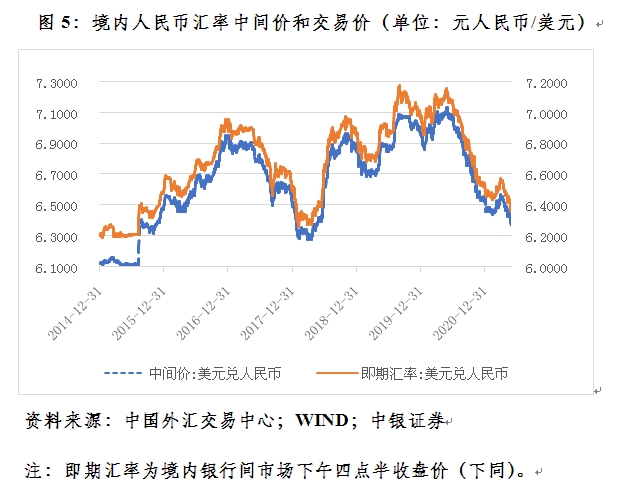 2015年“8·11”汇改以来,人民币汇率(以下如非特指,均指人民币对美元双边汇率)一度较长时间面临贬值压力。2016年底、2018年底和2019年二季度,三次跌到7比1附近。2019年8月初第四次到7附近,7应声而破。然后,去年5月底进一步跌至7.20附近,创了十二年来的新低。从去年6月份起,人民币汇率震荡走高,到今年5月底累计升值12%(见图5)。