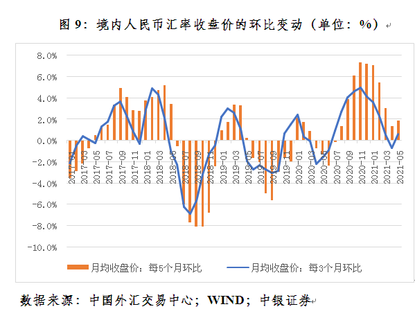 以月均人民币收盘价作为参照,可以测算这两次升值时期企业出口可能面临的汇兑损失(不考虑一年定一次价的出口长单)。假定2017年初至2018年3月底,企业出口从接单到收款的账期最长为3个月。按此测算,每3个月人民币环比升幅在4%以上的只有2018年2、3月份,平均升幅为4.6%。而去年6月初至今年5月底,假定企业出口从接单到收款的账期最长为5个月。依此测算,每5个月人民币环比升幅在4%以上的月份为去年10月份至今年2月份,合计5个月份,平均升幅为6.6%(见图9)。