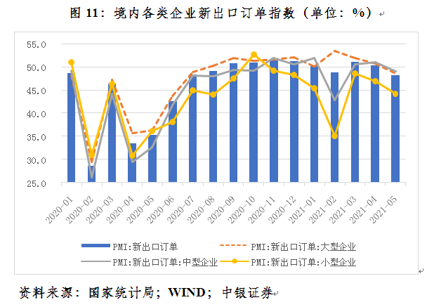 对于当前中国经济恢复来讲,稳外贸的重要性不在于创汇,而在于保主体、稳就业。如果没了工作,就没了收入,扩大内需也就无从谈起。去年12月份以来,中国PMI中的新出口订单指数摸高回落,除今年3月份出现短暂反弹外,4、5月份连续回调,到5月份跌到48.3%,重新跌到荣枯线以下,为去年8月份以来最低。其中,小型企业新出口订单指数自去年11月份持续低于荣枯线,今年5月份为44.2%(见图11)。