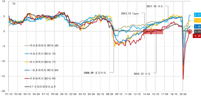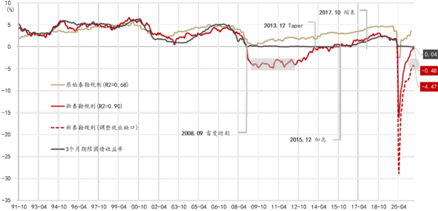 如果考虑到数据上的噪音,并对泰勒规则中的输入变量进行调整,可得到校正后的新泰勒规则(图5)。校正失业数据后,6月隐含的3个月短期利率为-4.47%,加息之路遥遥无期……