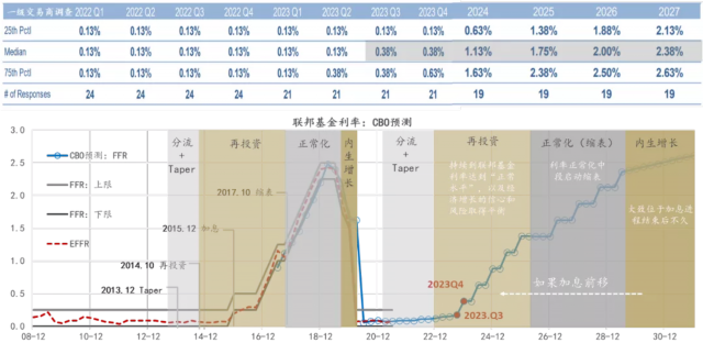 基于2021年3月的市场参与者调查数据,它给出了美联储资产负债表演化路径的基准预测:2021年全年维持每月1200亿美元资产购买规模,2022年初启动Taper,2022年底停止扩表,进入再投资阶段。12个月的Taper周期,意味着每个月缩减规模为100亿美元。截止到扩表终止时,美联储总资产规模将达9万亿美元,占GDP的比重为39%,准备金规模达6.2万亿美元。2021年6月的调查显示,加息起点前移,这意味着Taper也应该前移。