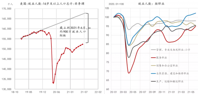 劳动市场方面,虽然2021年6月官方失业率已经下降到了5.9%,但这实际上低估了真实失业水平(图4)。美联储的目标是实现最大充分就业,而非最小失业率,后者未考虑劳动力参与率的变化。由于政策救助和潜在的安全隐患,就业的恢复偏慢,劳动力参与率较疫情前低2个百分点。与趋势线相比,16岁以上劳动人口绝对就业数量尚有900万缺口。结构方面,受疫情影响显著的服务业、原油和汽车价格上涨,交通运输业复苏最慢;低薪岗位和非裔等少数裔弱势群体的就业形势也更为严峻,而这些正是助推民主党入驻白宫的重要力量。