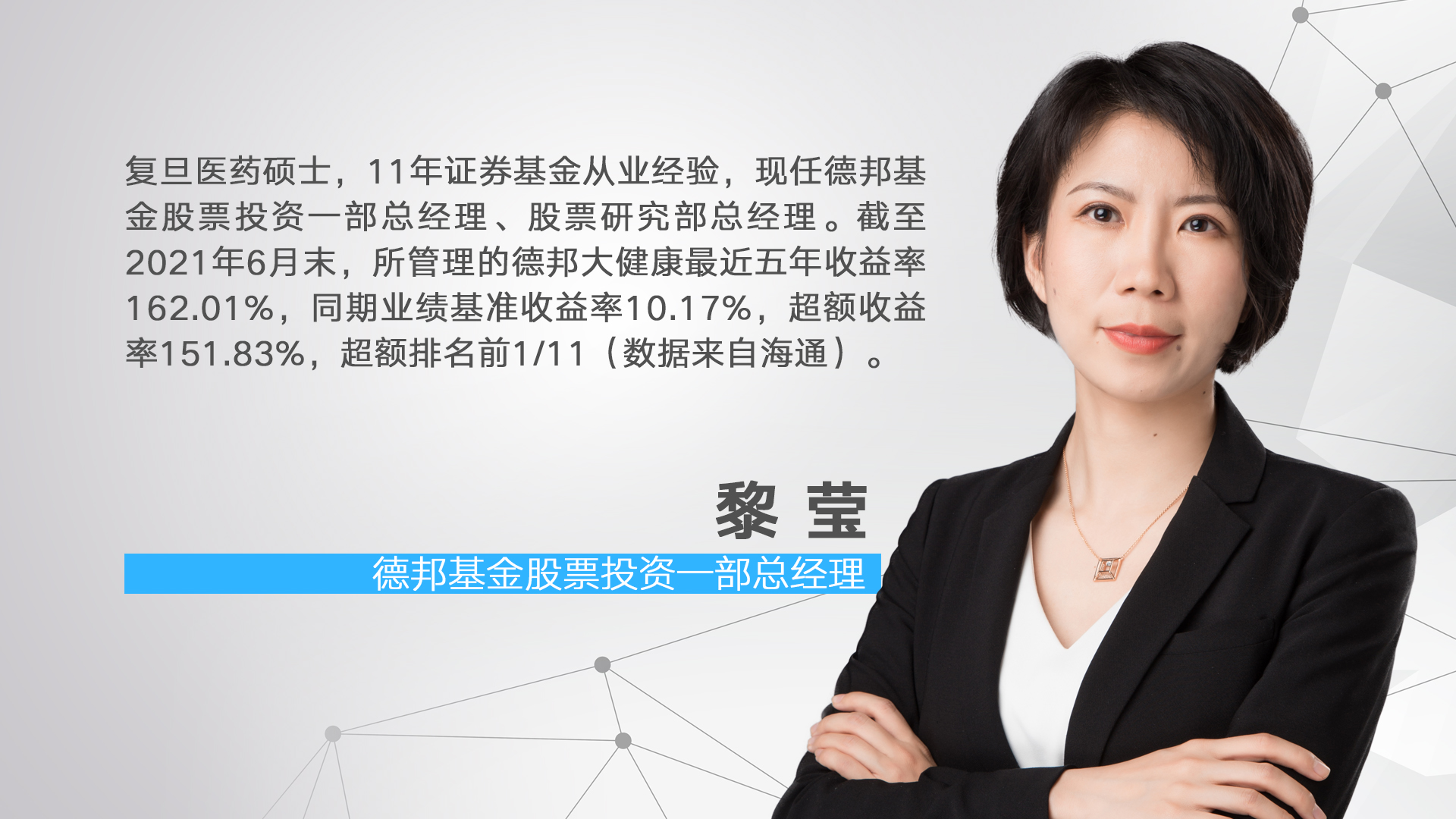 黎莹女士:复旦医药硕士,11年证券基金从业经验,现任德邦基金股票投资一部总经理、股票研究部总经理。截至2021年6月末,所管理的德邦大健康最近五年收益率162.01%,同期业绩基准收益率10.17%,超额收益率151.83%,超额排名前1/11(数据来自海通)。