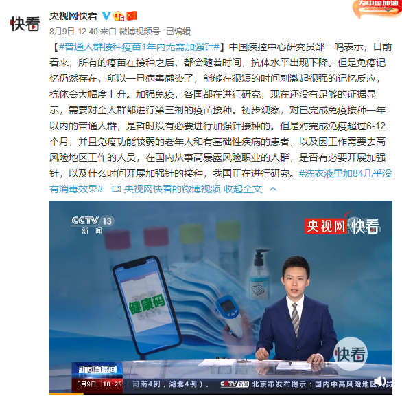 中国疾控中心研究员邵一鸣表示,目前看来,所有的疫苗在接种之后,都会随着时间,抗体水平出现下降。但是免疫记忆仍然存在,所以一旦病毒感染了,能够在很短的时间刺激起很强的记忆反应,抗体会大幅度上升。加强免疫,各国都在进行研究,现在还没有足够的证据显示,需要对全人群都进行第三剂的疫苗接种。