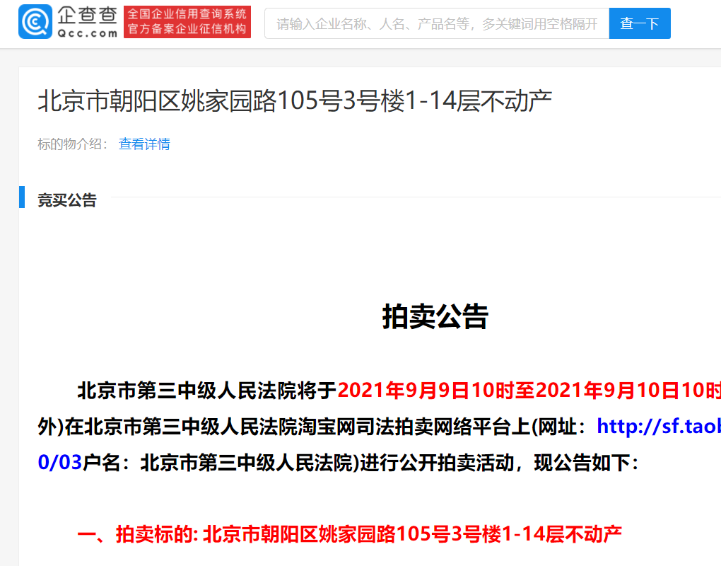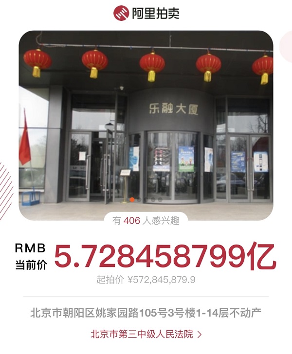据阿里拍卖,北京市朝阳区姚家园路105号3号楼1-14层不动产,即乐融大厦(此前名为乐视大厦)将于9月9日被拍卖,起拍价为572845879.9元。