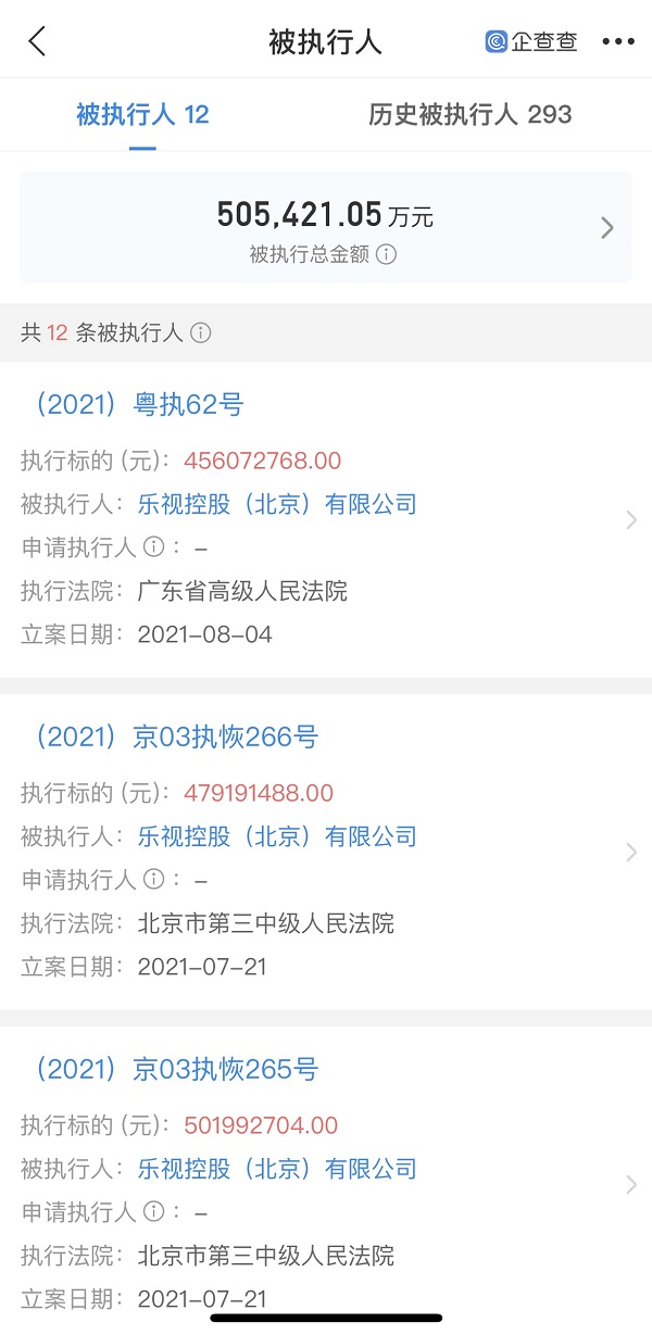 企查查显示,目前乐视控股(北京)有限公司共有12条被执行人信息,当前被执行总金额超50亿。