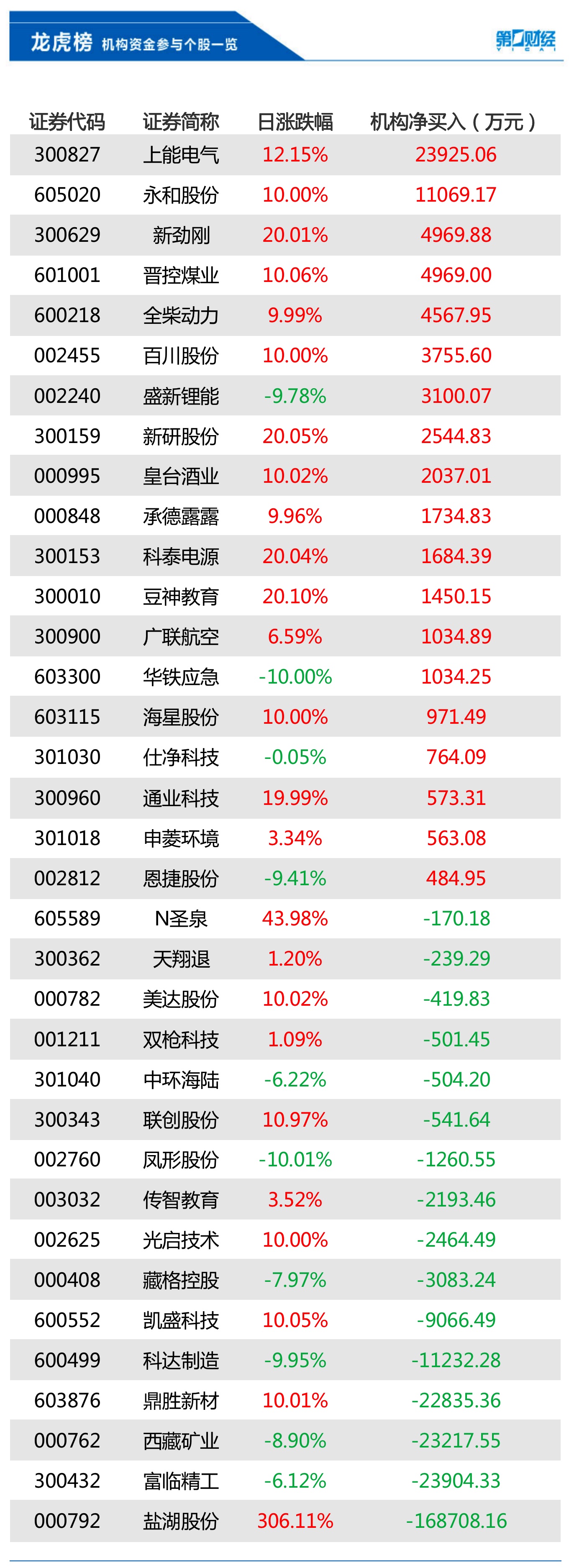 当天机构净买入前三的股票分别是上能电气、永和股份、新劲刚,净买入金额分别为2.39亿元、1.11亿元、4970万元。