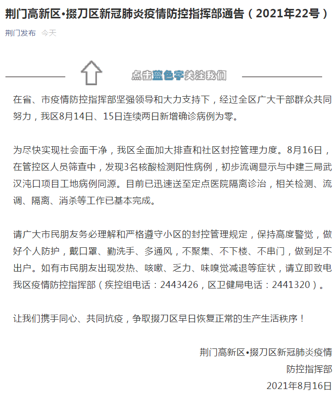 荆门高新区•掇刀区新冠肺炎疫情防控指挥部通报,8月16日,在管控区人员筛查中,发现3名核酸检测阳性病例,初步流调显示与中建三局武汉沌口项目工地病例同源。目前已迅速送至定点医院隔离诊治,相关检测、流调、隔离、消杀等工作已基本完成。