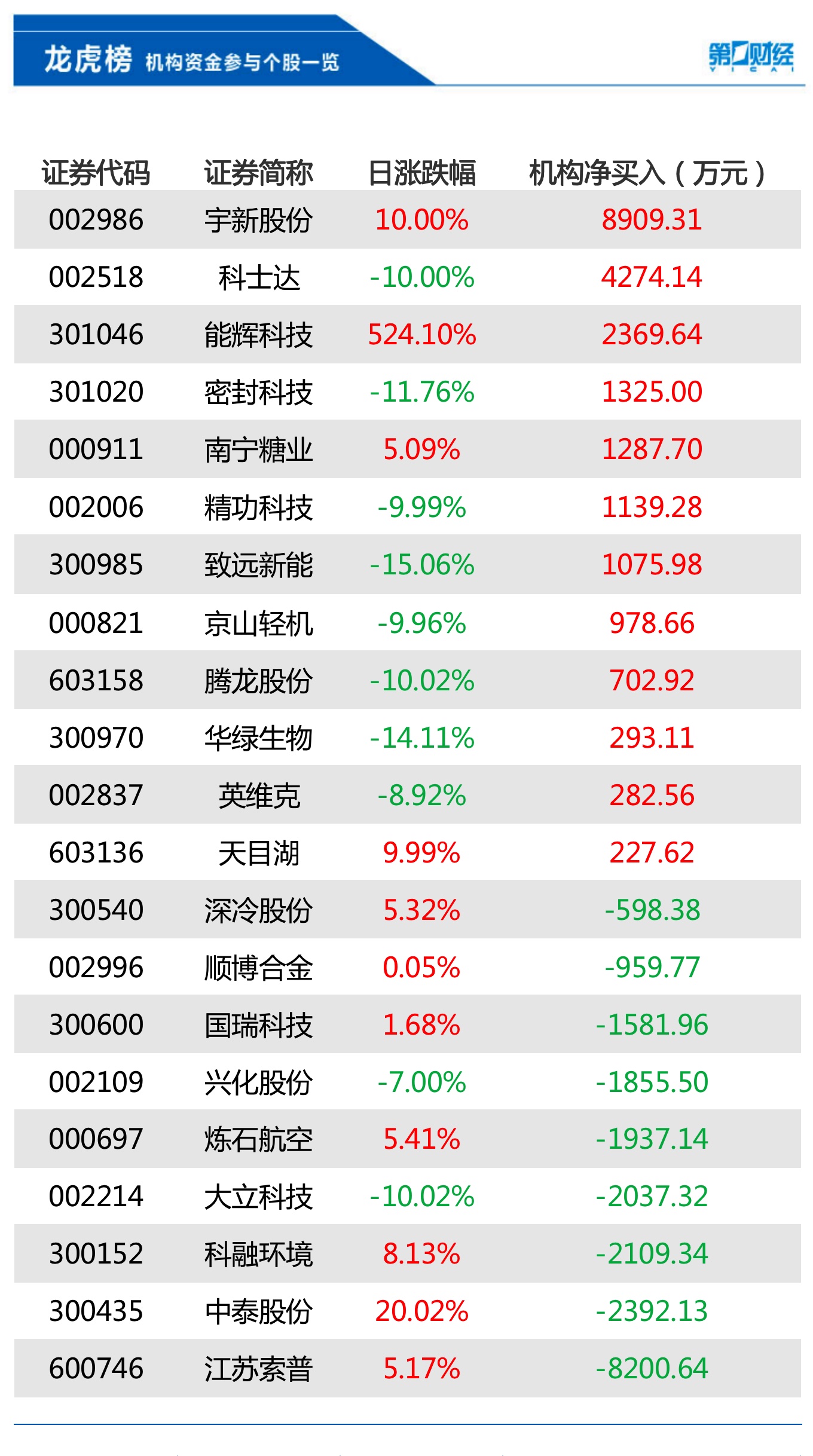 当天机构净买入前三的股票分别是宇新股份、科士达、能辉科技,净买入金额分别为8909万元、4274万元、2370万元。