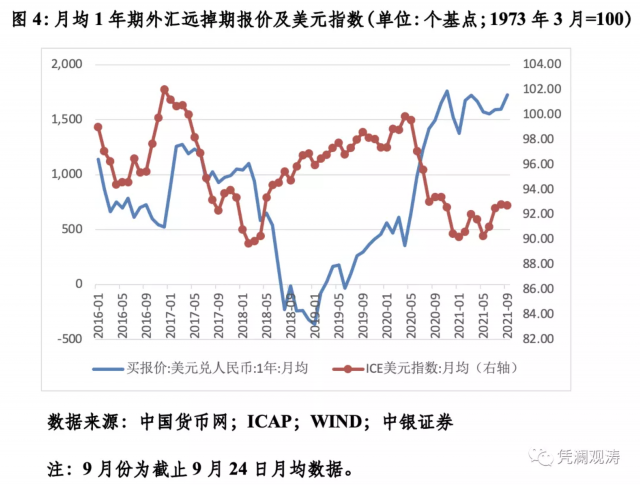此外,6月份一次性提高金融机构外汇存款准备金率2个百分点的措施后,6至9月份,月均1年期人民币/美元远期掉期点子分别为1555、1591、1597和1726个基点。这表明提准措施对境内外汇流动性的实质影响有限,6月初以来人民币汇率冲高回落主要是因为国际市场美元指数走强。9月份,月均ICE美元指数为92.76,较5月份累计上涨2.7%(见图4)。