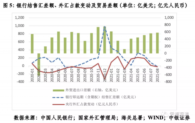 本轮人民币升值过程中,贸易顺差与银行结售汇顺差的相关性也比较低。从去年1月份至今年8月份,海关进出口差额与银行即远期(含期权)结售汇差额的相关性为极弱正相关0.149,其中今年2月份至8月份更是转为极弱负相关0.265。今年8月份,海关进出口顺差583亿美元,环比增加19亿美元,但银行即远期(含期权)结售汇逆差,环比扩大97亿美元(见图5)。