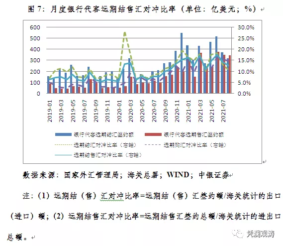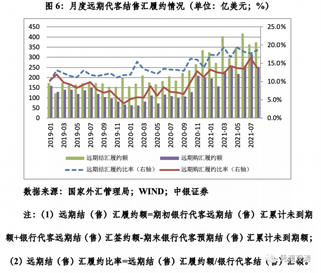 未到期远期净结汇额下降较多,一方面是因为前期应对汇率升值的远期结汇大量到期履约。当月,远期结汇履约374亿美元,远期结汇履约占比为18.6%,环比上升0.9个百分点;远期购汇履约253亿美元,远期购汇履约占比为13.8%,环比下降2.6个百分点;远期结售汇履约顺差121亿美元,环比增加74亿美元(见图表6)。