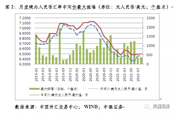人民币汇率维持窄幅波动。全月,汇率中间价最高为6.4610,最低为6.4984,最大振幅374个基点,环比上升10%,但较上半年月均最大振幅回落61%(见图2)。