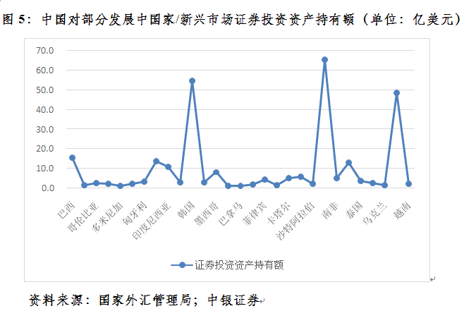 根据全口径数据,到去年底,我国还在阿联酋(49亿美元)、巴西(15亿美元)、印度(14亿美元)、印尼(11亿美元)、墨西哥(8亿美元)、俄罗斯(6亿美元)、泰国(4亿美元)、土耳其(3亿美元)、沙特(2亿美元)、秘鲁(2亿美元)、哥伦比亚(2亿美元)、巴基斯坦(1亿美元)等新兴市场有着诸多金融联系或者说风险敞口(见图5)。即便现在要加工我国对区域全面经济伙伴关系协定(RCEP)缔约国证券投资的数据,也可以信手拈来。