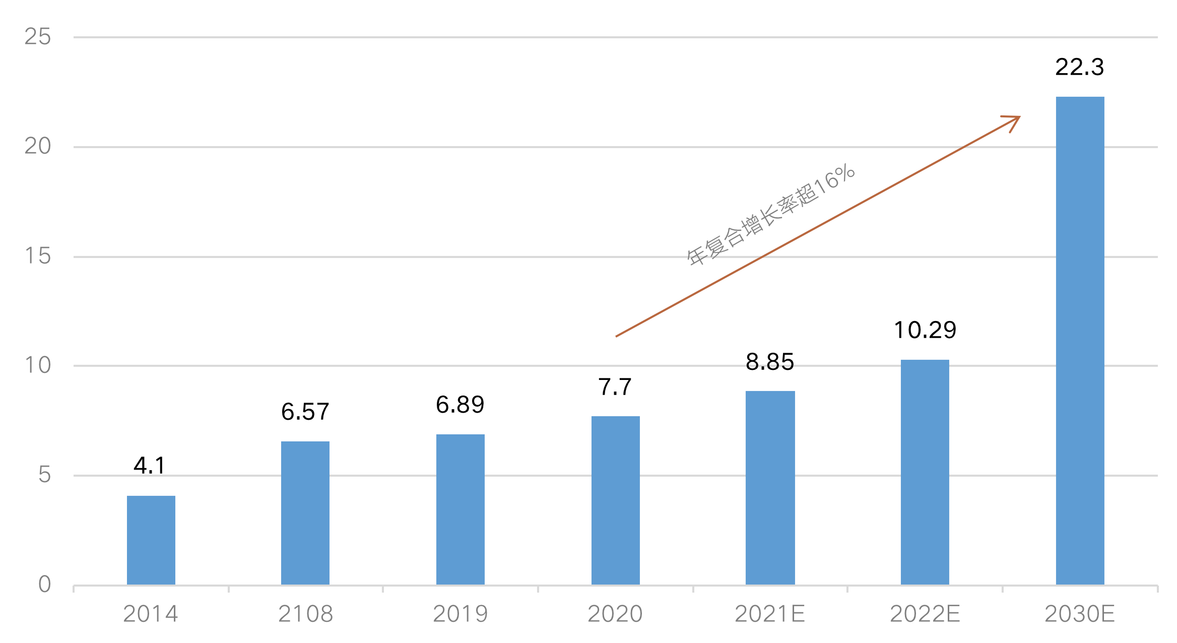 未来的10年,随着建国后的第二代“婴儿潮”即将步入老龄人群,养老市场将进入一个更加高速的增长阶段。老年人口将是40后刚需老人、50后未富先老人群、60后边富变老人群并存局面。预计在2030年,养老产业规模将超过22万亿元,年复合增长率将超过16%。