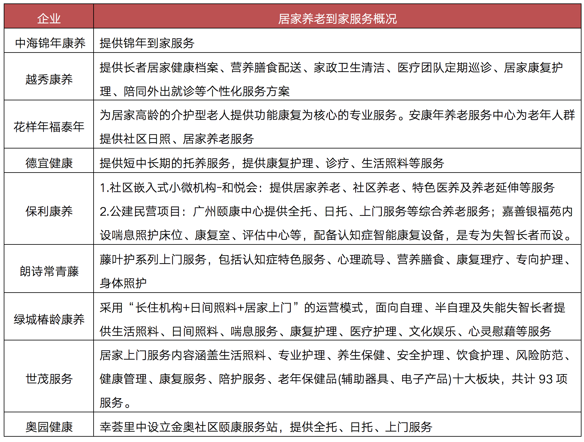 据克而瑞物管盘点,目前提供上门服务的企业有9家,这部分业务的更契合社区居家养老,足不出户便可以享受到全方位的生活和健康照料。