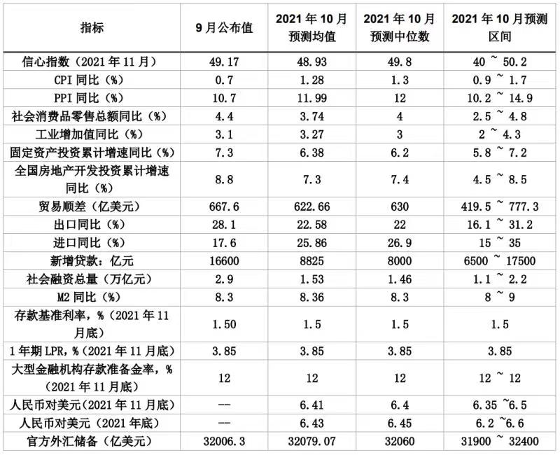 物价方面,经济学家们对10月CPI同比增速的预测均值为1.28%,PPI同比预测均值为11.99%。投资与消费方面,10月固定资产投资累计增速预测均值为6.38%,社会消费品零售总额同比增速预测均值为3.74%。贸易方面,进出口同比数据及贸易顺差预测均值低于上月,但仍保持强劲。