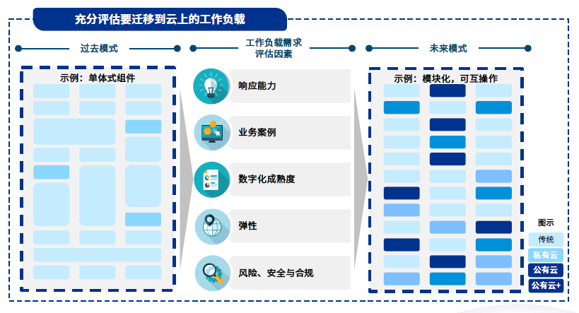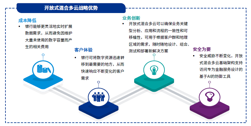 而面向未来的多云战略,对于许多区域性银行而言,这更是一个阶梯式的决策过程。一般而言,银行首先需要构建私有云环境,将本地工作流迁移到安全、合规且完全拥有的技术框架中。其次,银行会在公有云上开展运营有助于降低运营成本,并且能够更好地接触外部生态系统。当银行考虑采用开放式混合多云方法时,其目标是让每一种环境都能处理最擅长的工作,让每个工作负载都处于合适的位置,从而降低风险,提高敏捷性。