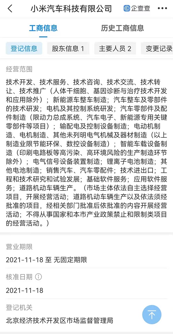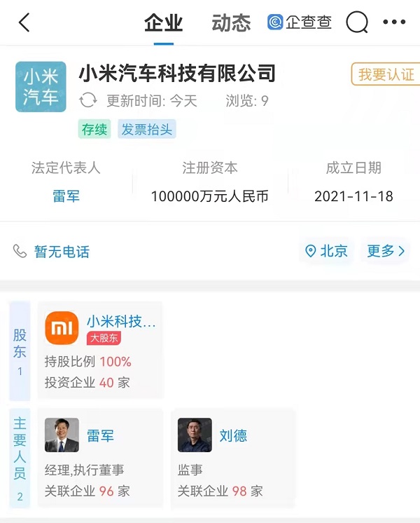 企查查显示,18日,小米汽车科技有限公司成立,法定代表人为雷军,注册资本为10亿元人民币,经营范围包含新能源车整车制造、技术开发等,公司注册地为北京,此前小米曾100亿人民币成立小米汽车有限公司。