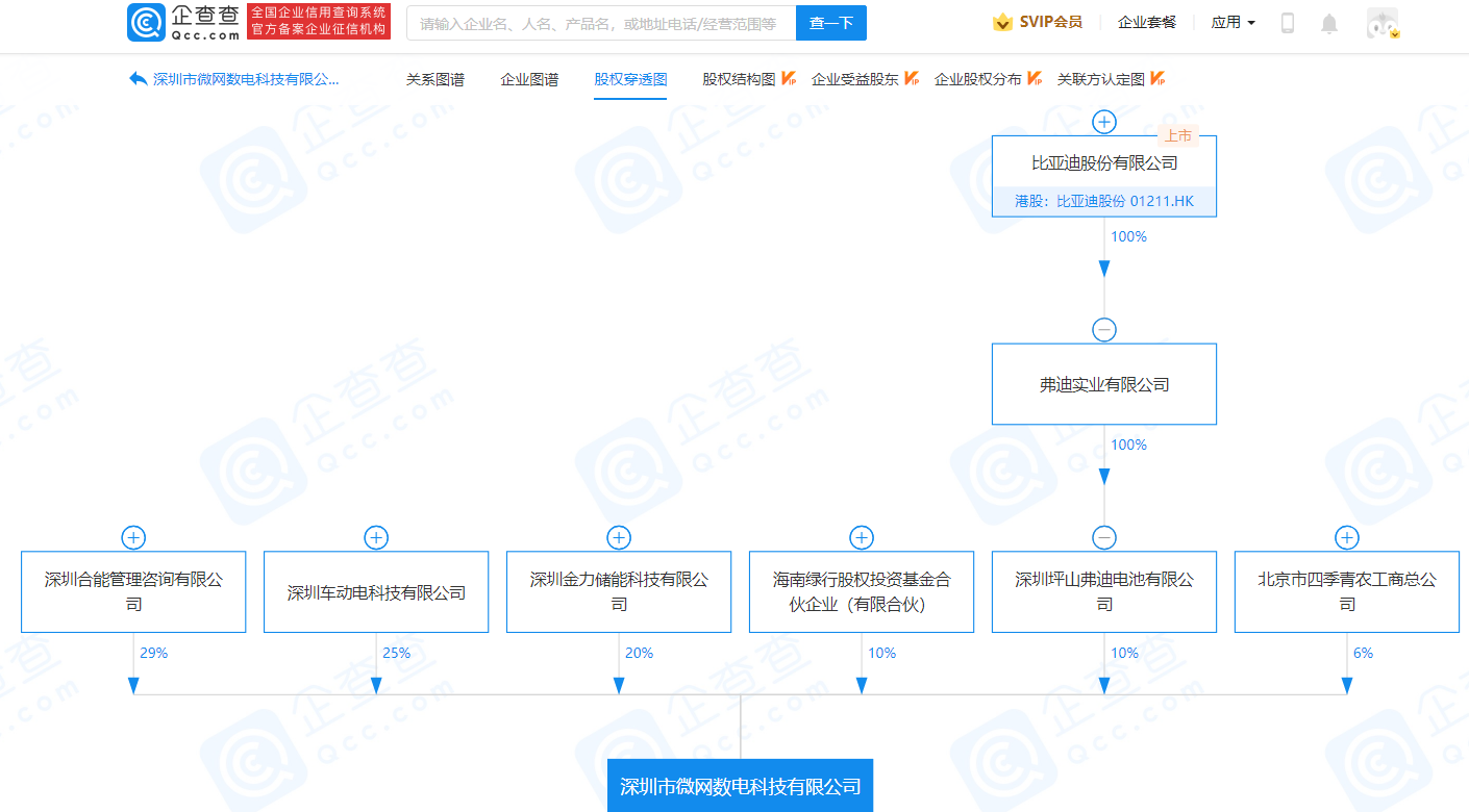 企查查股权穿透显示,该公司由比亚迪关联公司深圳坪山弗迪电池有限公司等共同持股。