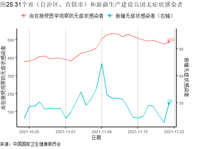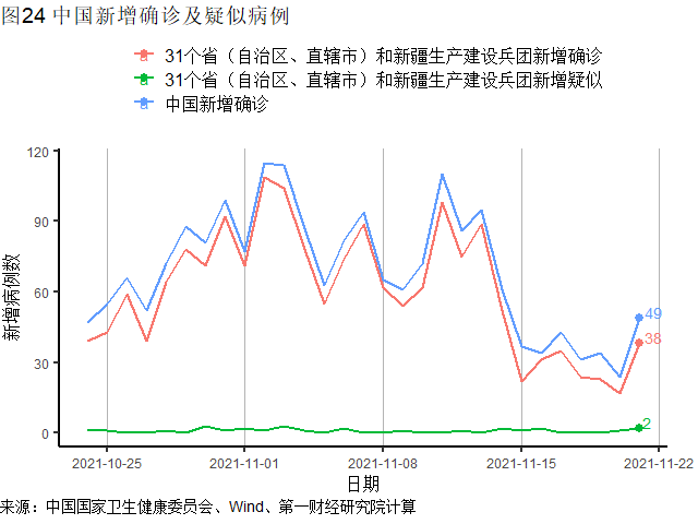 根据中国国家卫健委数据,上周31省(自治区、直辖市)和新疆生产建设兵团报告新增确诊病例190例,其中本土病例47例;新增无症状感染者134例,其中本土无症状感染者6例。自11月16日以来,每日本土新增病例、新增无症状感染者均维持在个位数,疫情明显缓和。